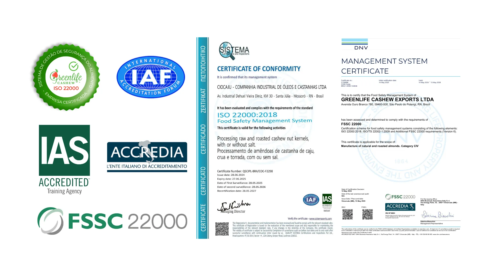 A GreenLife Cashew compromete-se integralmente com a segurança e a qualidade dos alimentos, garantindo o cumprimento de todos os requisitos legais e acordados com os clientes, por meio da formação e manutenção de uma equipe técnica altamente capacitada, da utilização de uma infraestrutura moderna com constantes inovações tecnológicas, da adoção de práticas de melhoria contínua em seus sistemas de gestão da qualidade e segurança do alimento, e da implementação de ações voltadas à sustentabilidade ambiental, à saúde e à segurança ocupacional em todos os níveis da organização.